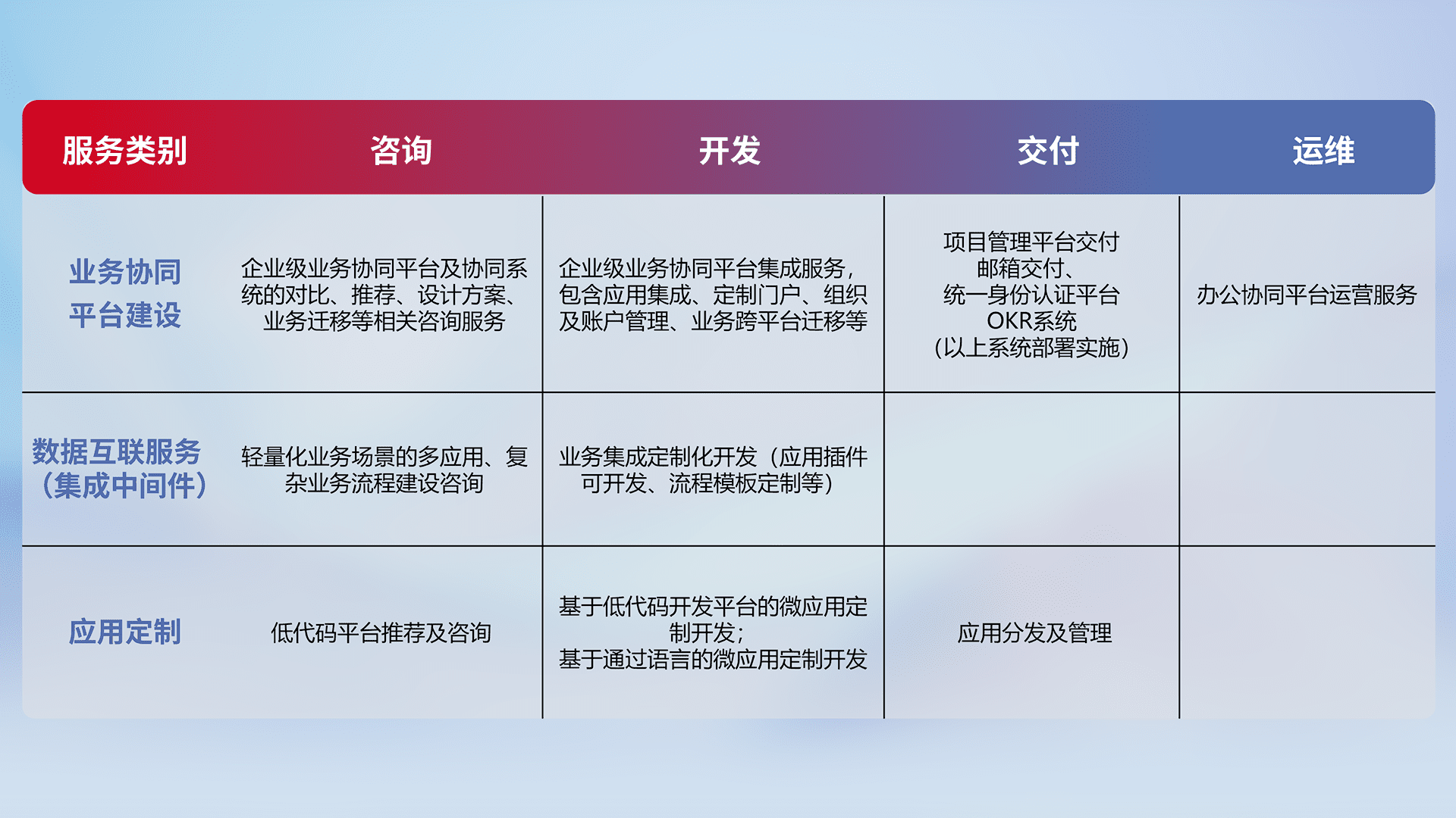 针对钉钉、、、、企微、、、IDaas等平台级产品提供产品的规划、、、、方案、、、交付、、定制化开发等服务,,实现如统一协同办公、、、智能客户服务、、、混合会议管理、、智能数据查询、、、等业务场景,,,,实现数字化转型。。。。