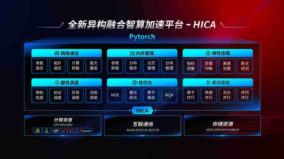 通过自研的服务层、、、、中间适配层、、、以及调度编排算法,,,采用数据并行、、、模型并行等多种并行方式,,,把并行计算任务进行有效的分解,,,使其分别由相应的软件栈和算力资源来承接。。当GPU资源变化,,,HICA可以实时动态调度计算子任务并调整模型拓扑和架构,,,以充分聚合各种算力资源。。。。