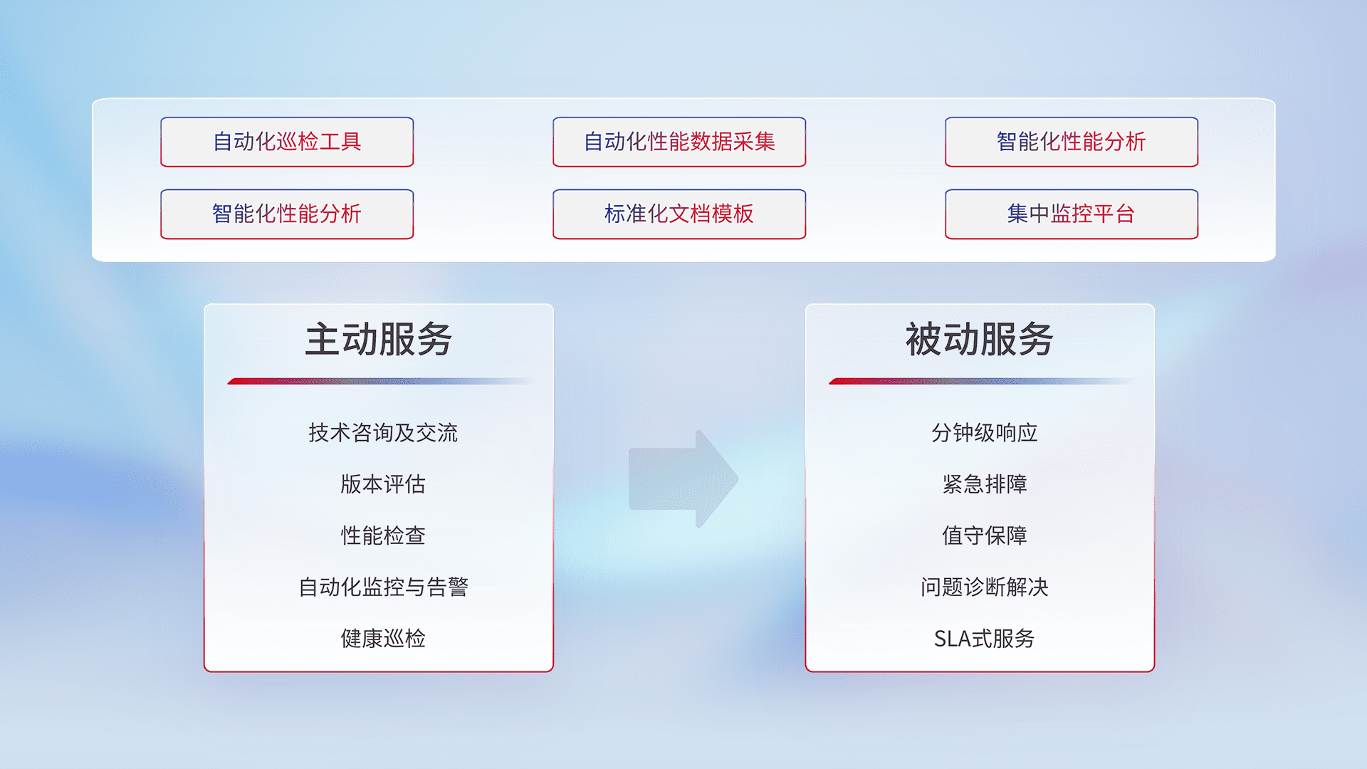 智能化工具和标准化文档,,保障服务质量,,,,提供主动服务(包含技术咨询、、、、版本评估、、性能检查、、、自动化监控与告警、、、健康巡检)和被动服务包含(分钟级响应、、紧急排障、、值守保障、、、问题诊断解决、、、、SLA服务)。。